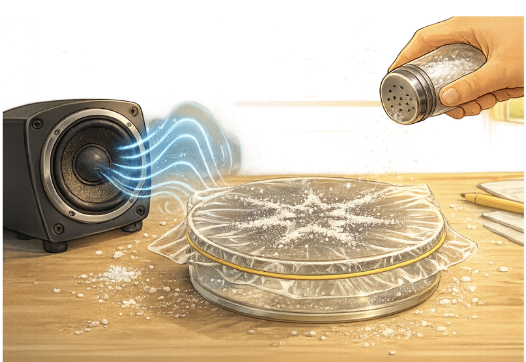 Colocan sal sobre un plástico tensado y acercan un altavoz. Observan cómo las vibraciones del sonido hacen moverse la sal.